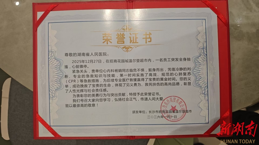 華聲在線1月13日訊(全媒體記者 周倜 通訊員 劉玉君 彭希 張艷)“雖然這份感謝來得有些晚,但代表了我們超市全體員工最誠摯的心意。1月12日,長沙某超市老板王女士專程來到湖南省人民醫院,將一本精心制作的榮譽證書送到心血管內科一病區主管護師楊娟手中,以此致謝她在2025年底在超市購物時,挺身而出挽救心臟驟停員工的義舉。